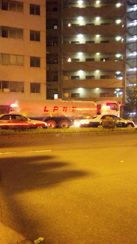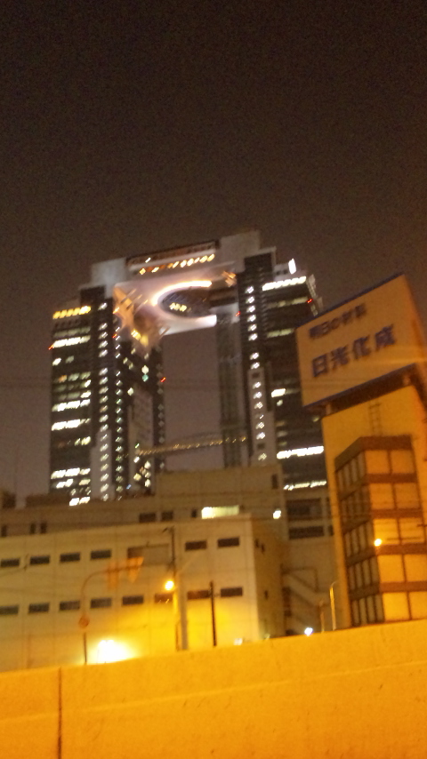 夜の中津・大淀周辺にて。左はスカイビル、右は歩いてたらパトカーが止まってたから撮った。夜の写真は拡大しないほうがマシです。画質は悪い。
