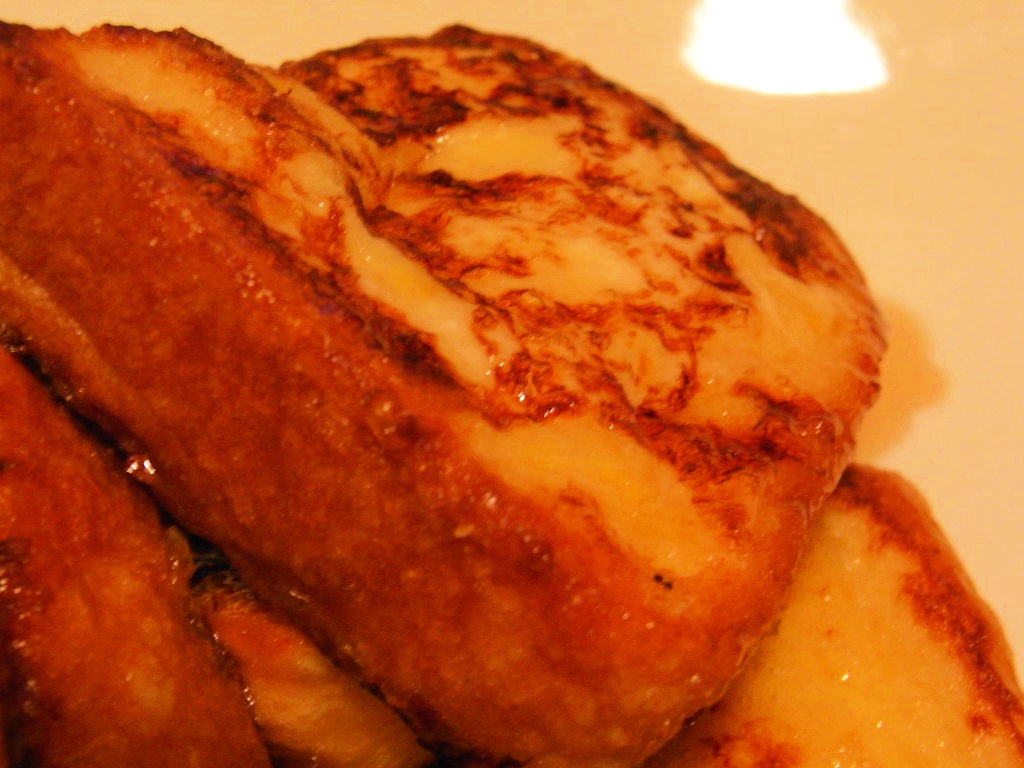 白熱灯の下だと、なんか全体的にオレンジ色が強調されてしまって、調節がきかない・・・。真っ白なお皿に乗っかったフレンチトーストっていうイメージだったんですけど。