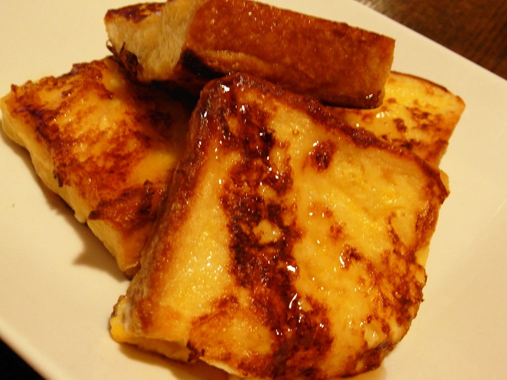 作り方は完全に普通で、溶いた卵に砂糖と牛乳を入れて、切ったパンを浸して焼いただけ。フライパンからお皿にあげる前にバターを垂らしてなじませ、メープルシロップをかけて完成。