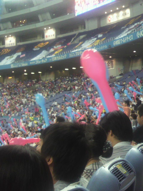 ラッキーセブンで流れるオリックスの歌に合わせて踊ってたら、今日の○○みたいな感じで選ばれてスクリーンに映し出されてなんか貰えたりするみたいです。オリックスはファンサービスが色々面白いって以前から言われてたけど、近鉄と一緒になってからも続いてるのかしら。ワンピースとのコラボフィギュアみたいなのはちょと欲しくなった(^_^)