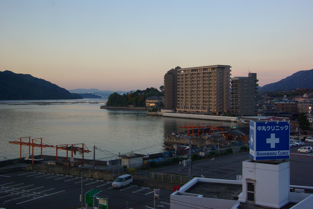 ホテルの部屋からの景色。宮島の鳥居が見える角度ではないものの、海が見えるなら十分です。快適でした。
