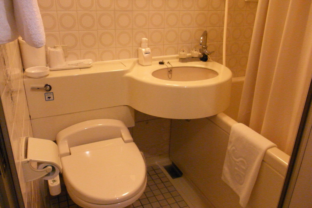 お風呂。シャンプー・リンス・ボディソープ・歯ブラシ・カミソリなど。床はタイル張りに見えますが、一応ユニットの一部っぽかった。