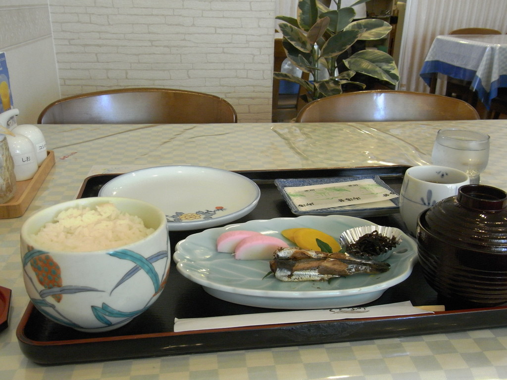 ご飯とみそ汁、手前のお皿はご飯のおかず的なもの。イワシか何かのショウガ煮みたいな感じでした。かつての私は絶対食べられないシロモノだったけど。本当に魚が食べられるようになったんだなあ・・・。母親が見たらびっくりするわ。