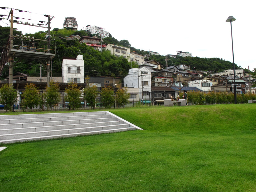 以前から工事か何かでずっとフェンスで囲われていた尾道駅前の一部は、小さな芝生の公園になっていました。