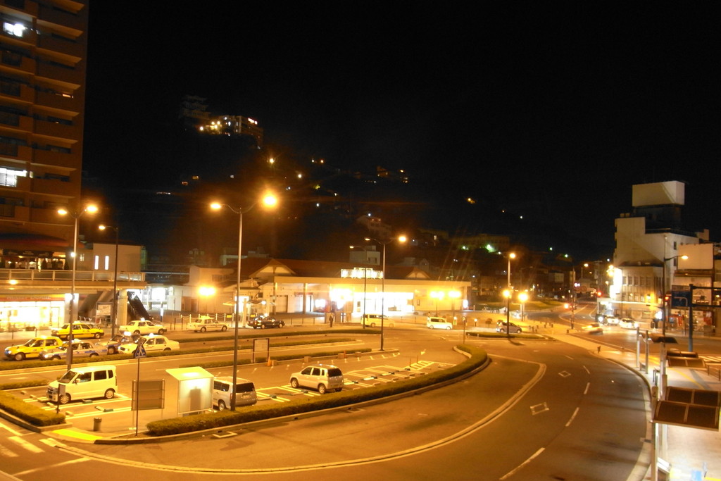 駅の背後には尾道城が見えます。ライトアップくらいしたらいいのになーって思いますが・・・。右隣のあかりは、たぶんこの界隈では一番景色がよさそうなホテル。泊まってみたいんですけど、夜にあの坂道のぼってあそこに行くのはちょっとなあ・・・と思い、ふんぎりがつきません(注・送迎はあります。私が自力で行きたいだけ)。