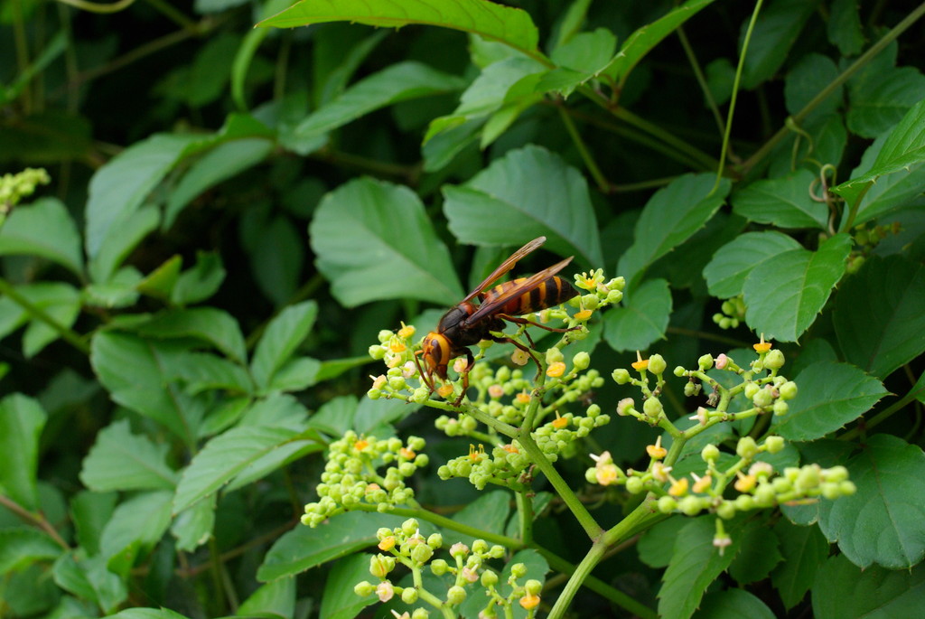 なんと、スズメバチを発見しました。危険と知りつつこの美しい体躯、撮らぬわけにはいかん。ズームできないレンズなのでかなり命がけで近づきましたよ・・・。