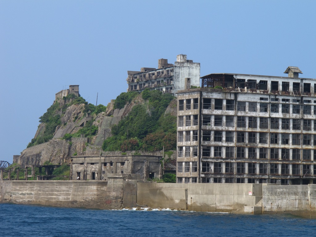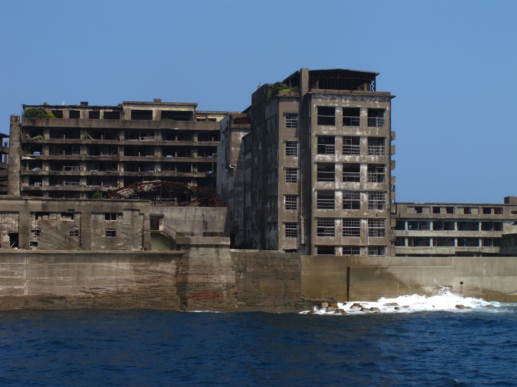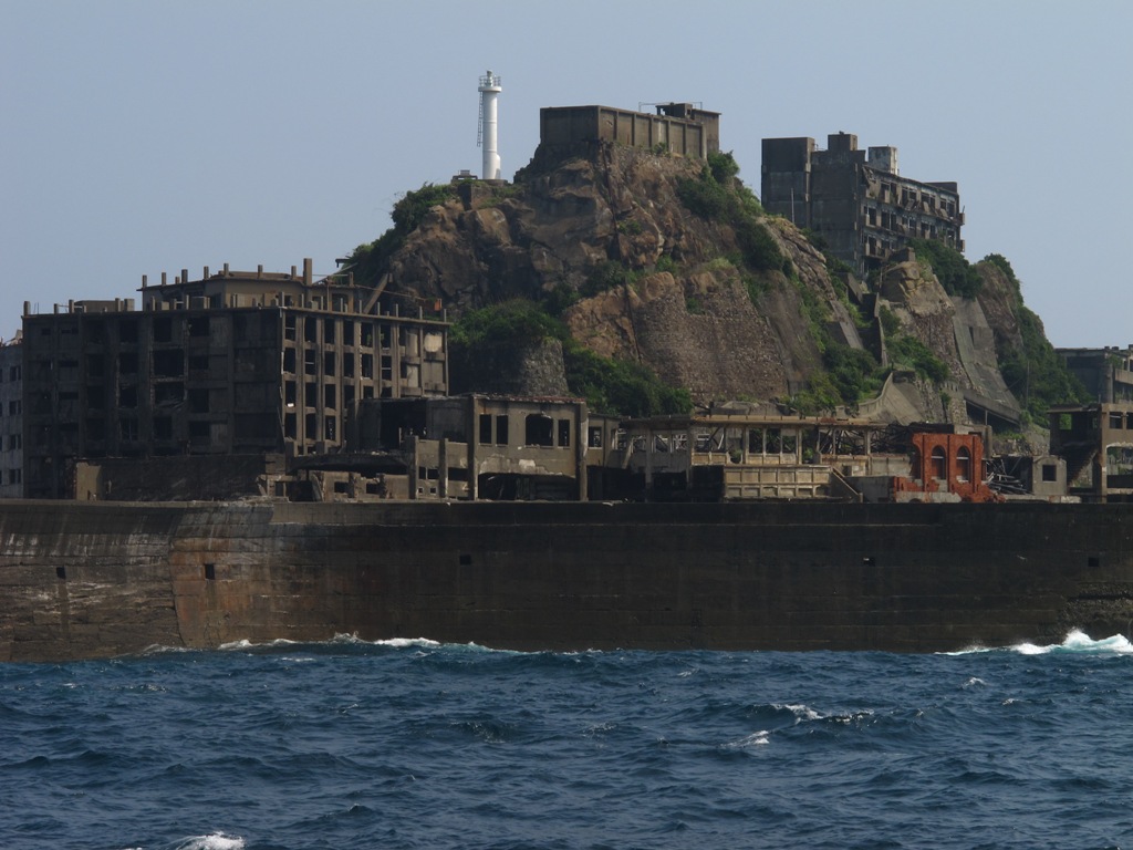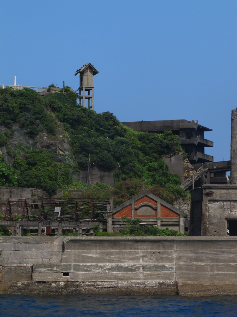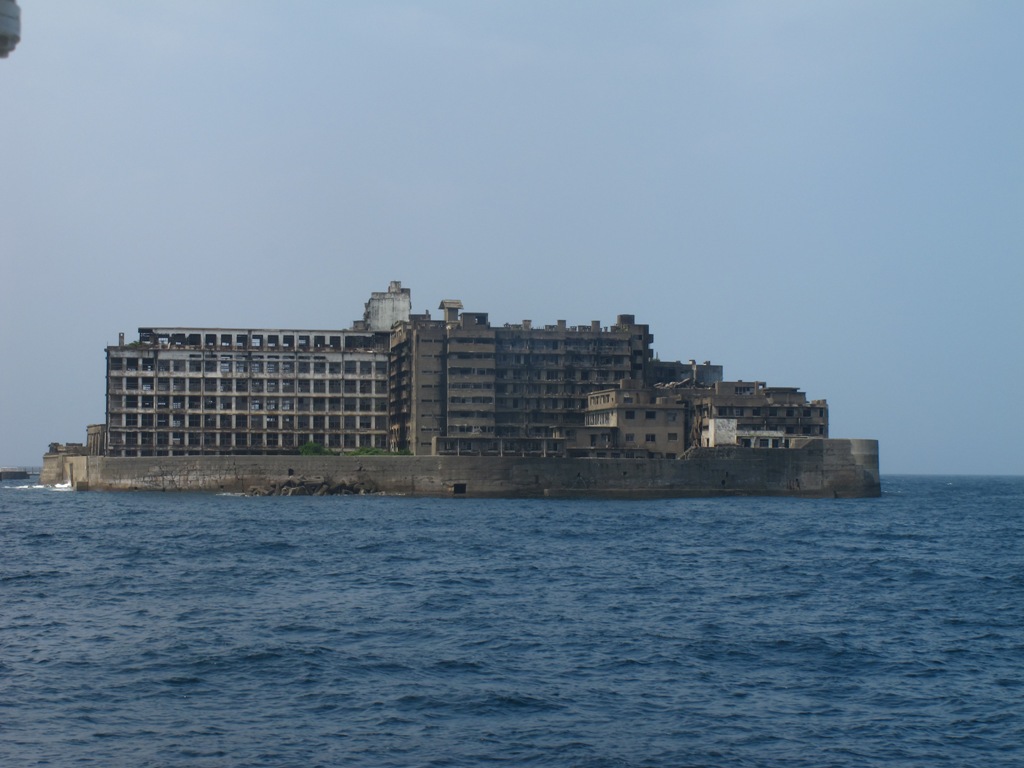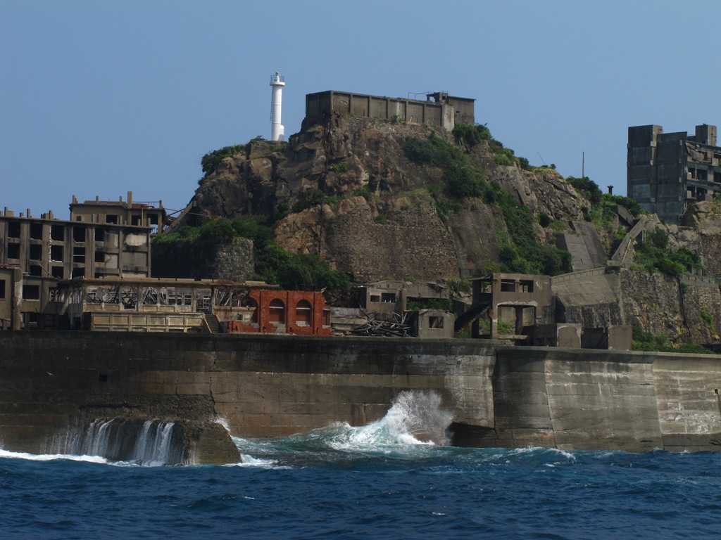すごい迫力。外海側から島を一周します。外海側からはアパート群が見えます。びっしりぎゅうぎゅうに建ってます。建築基準法とかどうなってんの!?ってくらい密集してます。人口密度日本一だったのも納得ですよ