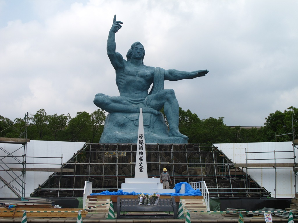 平和公園にやってきました。平和式典のためなのか、公園は草刈りしてたり、記念像もメンテナンス中なのでした。