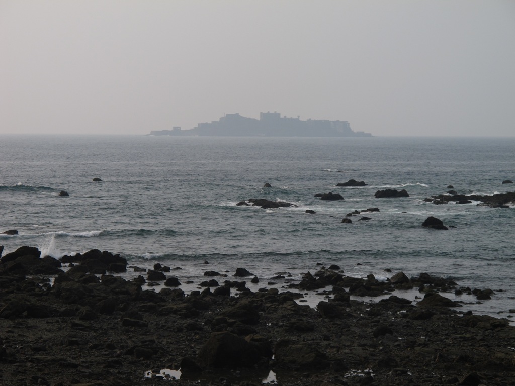 夕焼けに染まる海と軍艦島の光景を見たかったところですが、夕暮れには微妙に早く、また夕焼けになりそうにない煙った天候になってしまい、しばらく遠くに霞む軍艦島を見たり、軍艦島資料館を見て過ごしました。