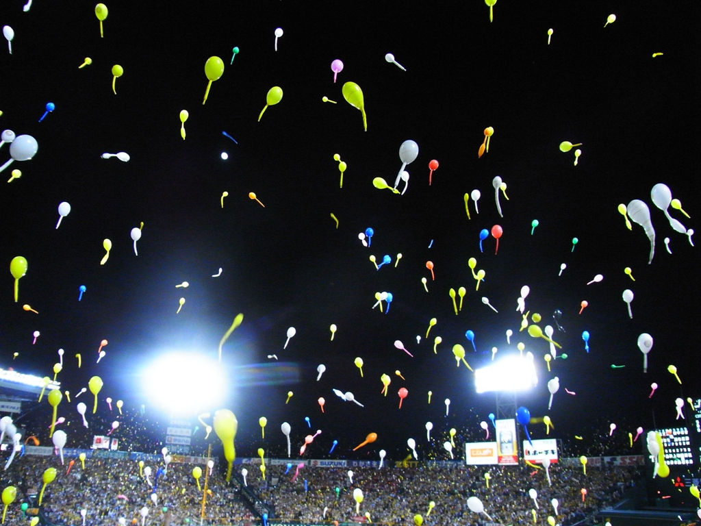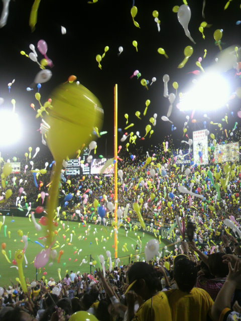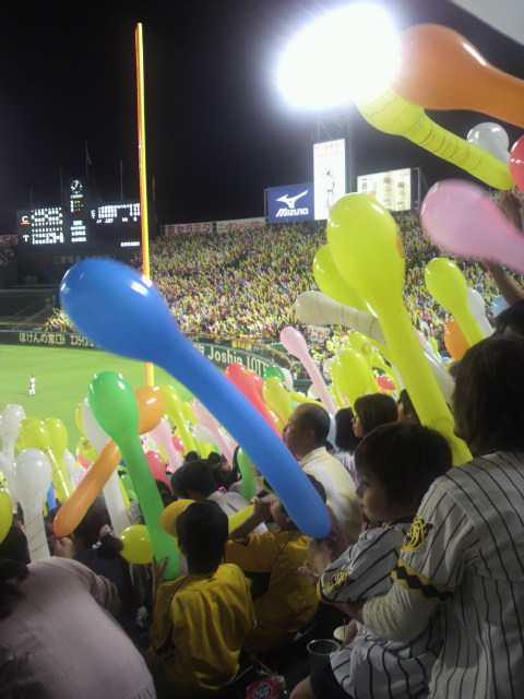 その後しばらくこう着してましたが、6回裏に坂と林のタイムリーで追加点をあげ、ラッキーセブンへ。いつも7回表は風船を膨らませるのですが、結構7回表にピンチになりふくらました風船を持ったままイライラすることが多いのです。7回を投げていたのはメッセンジャー→渡辺の次に出てきた久保田だったので、大丈夫かコラ!と思っていたのですが、予想に反してあっという間に打者を片づけてしまい、逆に慌てた。
