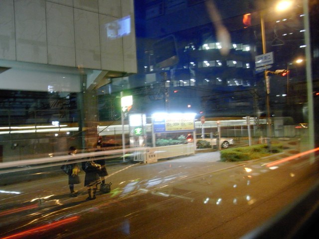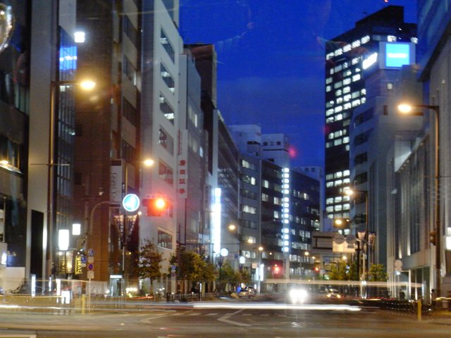 梅新。空の濃い青とライトの色合いがキレイだなー。ビルとビルの間に浮かぶ元気玉のようなものは、バスの中の照明です。次の停留所の案内も映ってます・・・