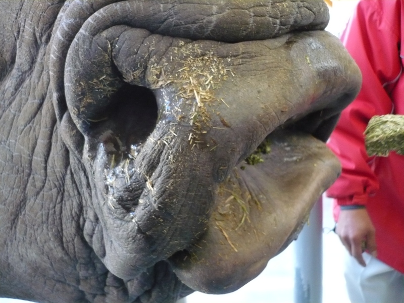 案内員の人がエサを配ってくれて、1人1人エサを口に放り込むのです。もっと獰猛な生き物のイメージでしたが、すごくおとなしくて(当たり前)優しい感じで拍子抜けしました。エサも引きちぎられたカモシカの足とかかと思っていたが、草をキューブ型に固めたような、小さなものでした。