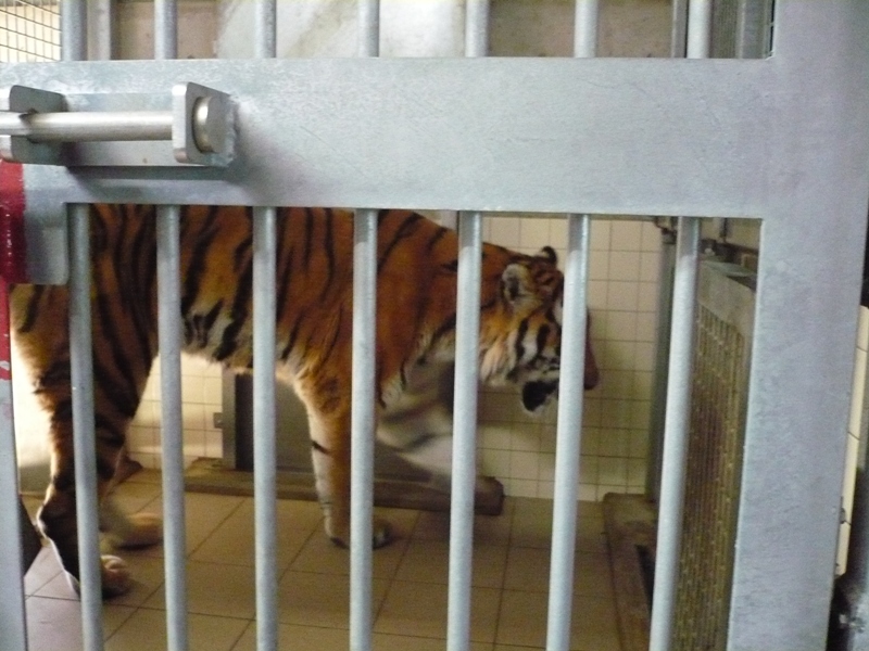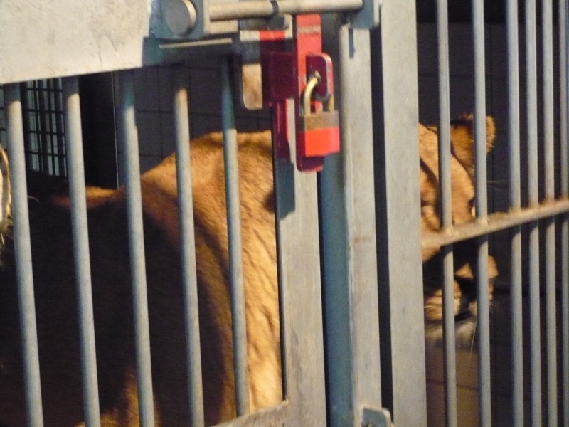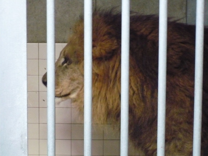 猛獣舎に入る前には足を消毒します。通路は真ん中だけ床の色が違っていて、そこをはみ出さずに歩くように念を押されます。それよりオリ寄りは動物の手が届くらしく、万一の時に危ないらしい。スリリングに私狂喜。うひょー!