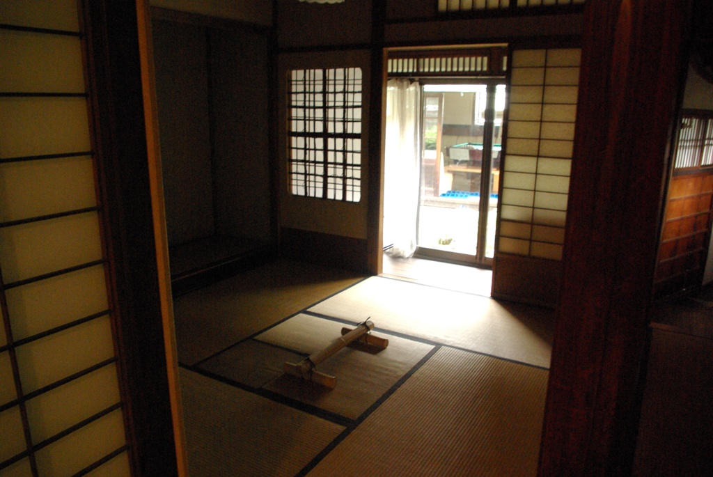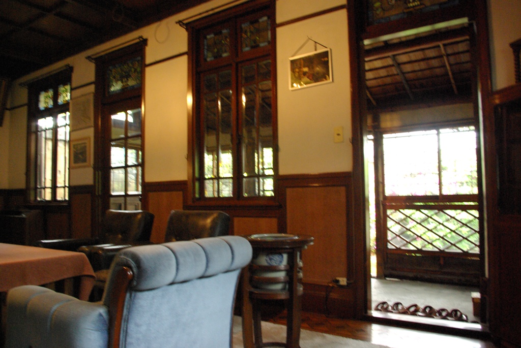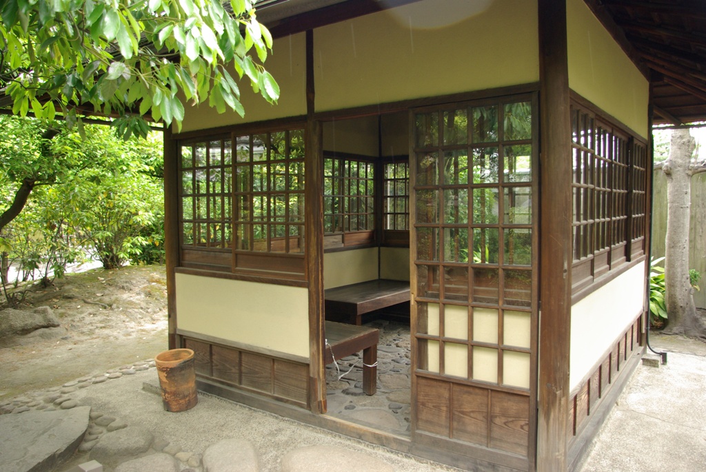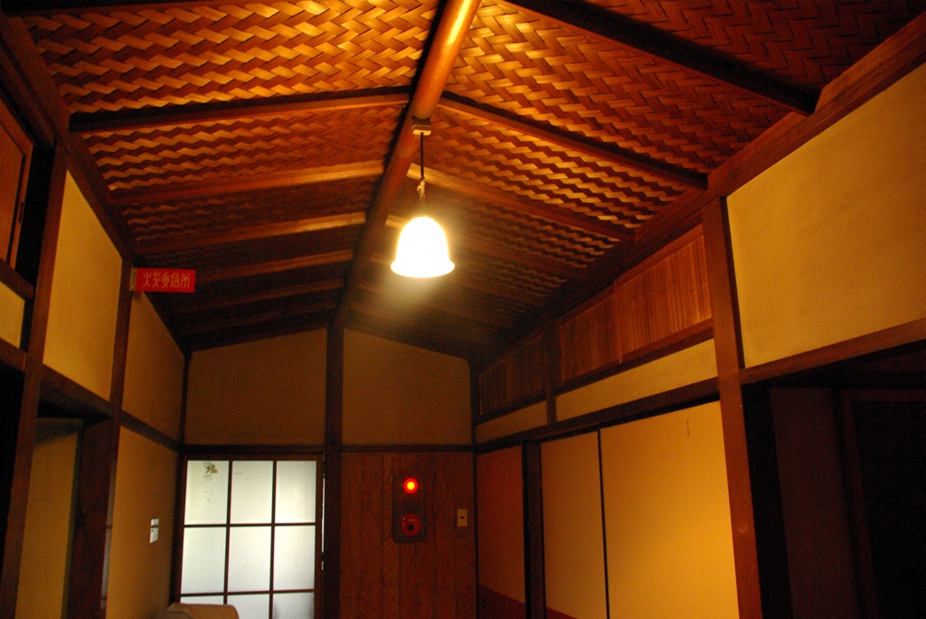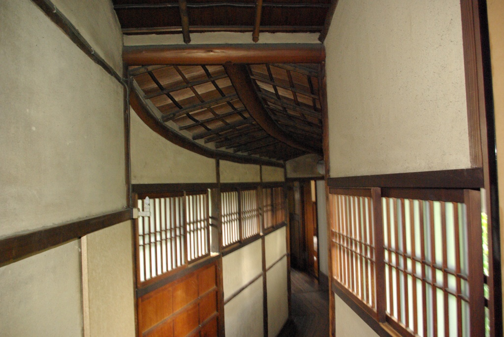 和室は茶の炉があります。右は廊下のような場所ですが、たぶん右手奥が厠かと思われる感じでした。こんな廊下を一つとっても船底型にあじろの天井です。柱の一本、窓ガラス一枚まで全く手抜きが無い!また、住む人はもちろんでしょうけど、来客への細やかすぎなくらい細かい配慮の数々は、私自身学ぶところが多いと感じました。また、ボランティアの方の詳しい説明があったからっていうのもあると思うけど、明治村や泉布観を見た時より感慨深いものがありました。