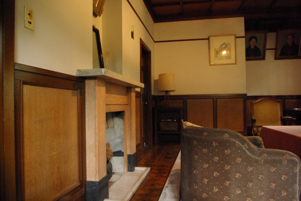 応接のようにソファとテーブルがあり、奥はサンルームになっています。右側の暖炉は形ばかりのもので、実際は火を起こさず電気を放熱するようなもの(電気ストーブ?)で部屋を温めていたそうです。