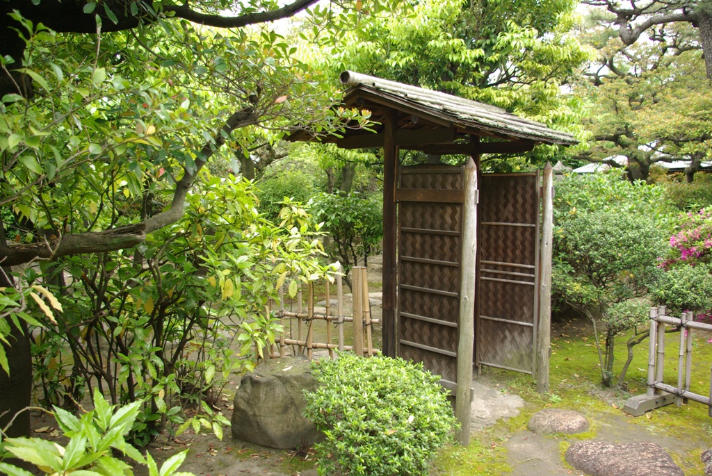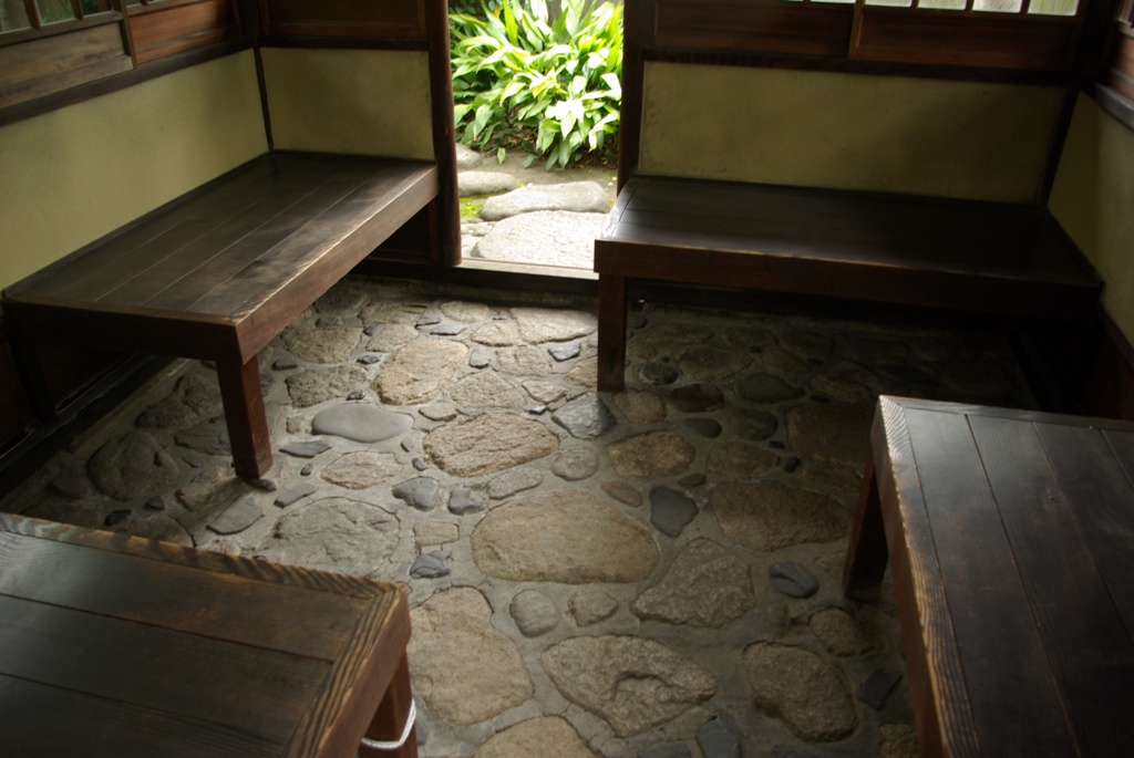 茶室の待合処。イスが卍を描くように並んでいるのは、中で待つ人同士が向かい合ってしまって視線がかちあわないようにするとか、どこに座っても庭がよう見えるようにだったりという細かい配慮がなされているとの事でした。確かに向かい合ってしまうと外を見るより前の人と話をするか、または下を向くしか無いもんなあ。外を見るには不自然に横を向かないといけないし。はああ~~(渡辺)