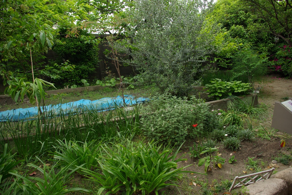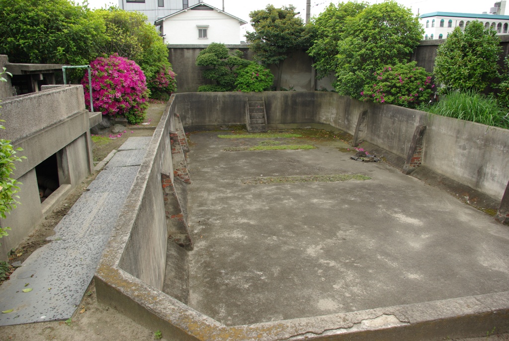 ここは防火水槽であり、プールとして一般開放もしてたそうです。プールとしてはちょっと深い。プールの左側にはガラス張りの温室があったそうですが、戦時中光って敵機の攻撃目標になり得ることから解体されてしまったそうです。ちゃんと暖房装置みたいなのがあったとか。