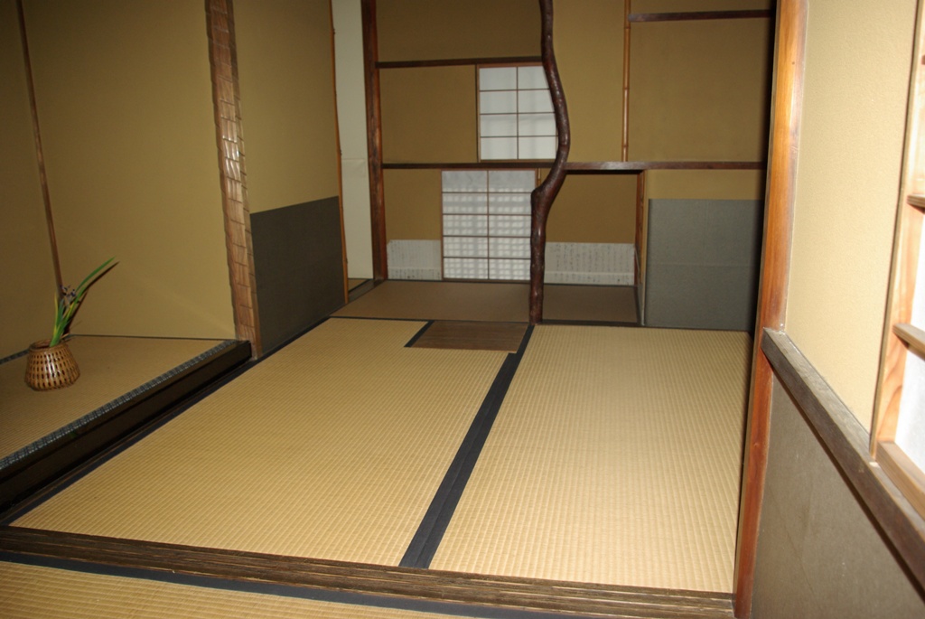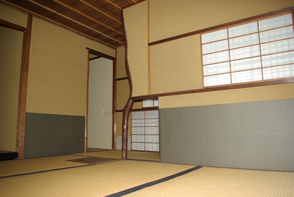 右・茶室(大) こちらは少し広い。武士の人を招く場合のために刀を置いておく棚とか、家来の人が座る場所とか、部屋に入れない家来の人が座って待つための置き石とかがありました。