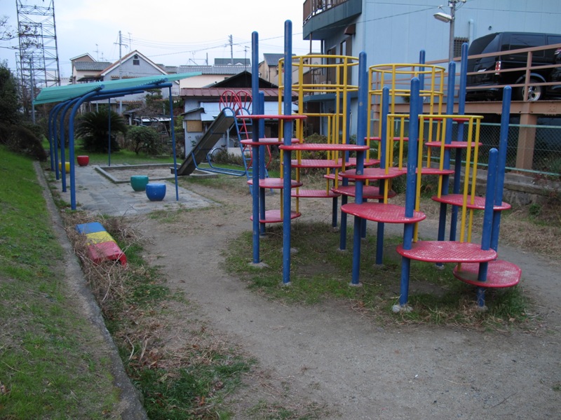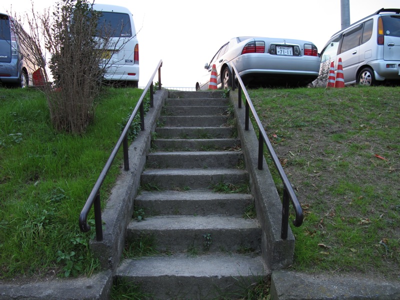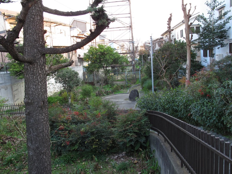 川沿いの道から公園に降りる階段。このあたり一帯は高低差がえらくあるんです。たぶんこの公園はかつて池かなんかだったはず。昔はこの階段もかなり高く感じたんですが、こんなに短かったっけ?って感じです。