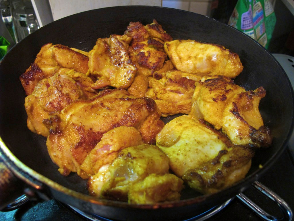 まず鶏のもも肉にカレー粉(エスビーのやつ)とクミン、ターメリックをもみこんで、フライパンで表面を焼く。これだけですでに美味しそうだ・・・焼き色がたまらんネー。
