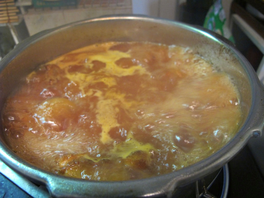 マンゴーチャツネ、ホールトマト、赤ワインを投入。普通の二口以上のコンロがある家庭なら片方で肉を煮込みつつ、一方で次の工程に移るところですが、我が家は一口なので、ここで圧力なべの蓋をして、ピンが上がったところで火から外して別の場所においておきました。
