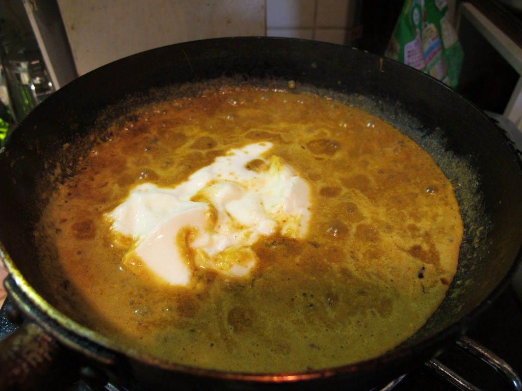炒め玉ねぎ(市販)、にんにく・しょうが(市販のチューブ)をフライパンで炒めつつ合わせて、さらにカレー粉(エスビーのやつ)、クミン、ターメリック、牛乳、ヨーグルトを投入